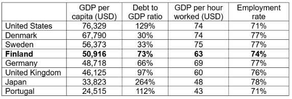 The report the quote above came from included a table of data showing that the economic situation in Finland was not that bad, as compared to the UK. Finns are not just much more equal than people in the UK, their overall GDP per capita is now much higher, they have less national debt, are more productive and have a similar proportion of people in work.