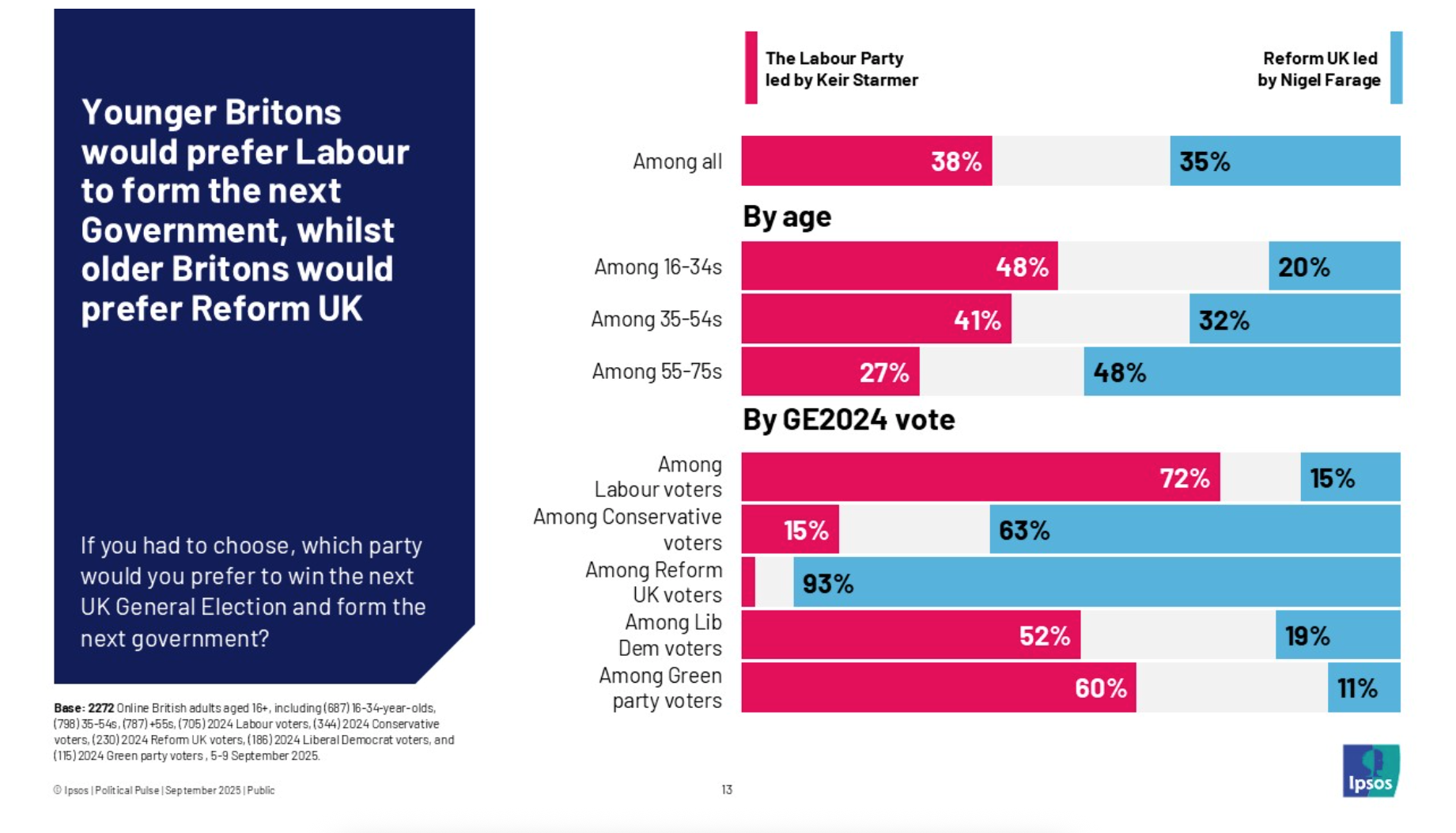 3 Ipsos, ‘Britons split on whether they would prefer Labour or Reform UK to win the next election’, Ipsos Insights Hub, 28 September 2025. https://www.ipsos.com/en-uk/britons-split-whether-they-would-prefer-labour-or-reform-uk-win-next-election