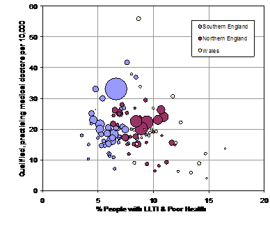 Example of results Provision of Health Care Analyses divide the country into unitary authorities, counties and former metropolitan authorities. The first graph here shows the relationship between the proportion of each area’s population with limiting long-term illness and poor health, and the number of qualified, practising medical doctors per head of population. It is apparent that the populations with the greatest need for health services have the lowest concentrations of qualified, working medical practitioners. This demonstrates the continued presence of an ‘Inverse Care Law’ (see J. Tudor-Hart (1971) The inverse care law, Lancet, 1, 406-412.). Graph 1: The inverse care law: areas with the highest levels of poor health tend to have the lowest numbers of medical practitioners.