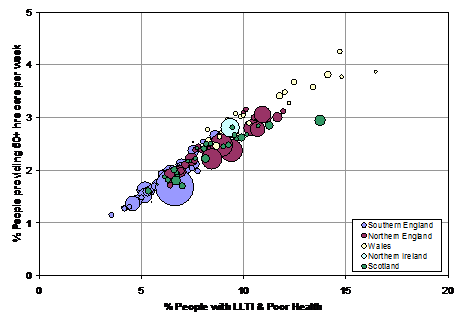 Note: In these graphs, each circle represents a county, unitary authoirity or former metropolitan county. The area of the circle is proportional to the population. However, the second graph shows that informal care (that provided by friends, relatives and neighbours) tends to be provided in almost direct proportion to need for that care. The map below illustrates the proportion of the population providing care across the UK. The graphs and map are taken from the reports ‘Doctors and Nurses’ and ‘In sickness and in health’, where these relationships are further described and analysed. Graph 2: The ‘positive care law’: areas with the highest levels of poor health tend to have the highest number of people providing care on an informal basis.